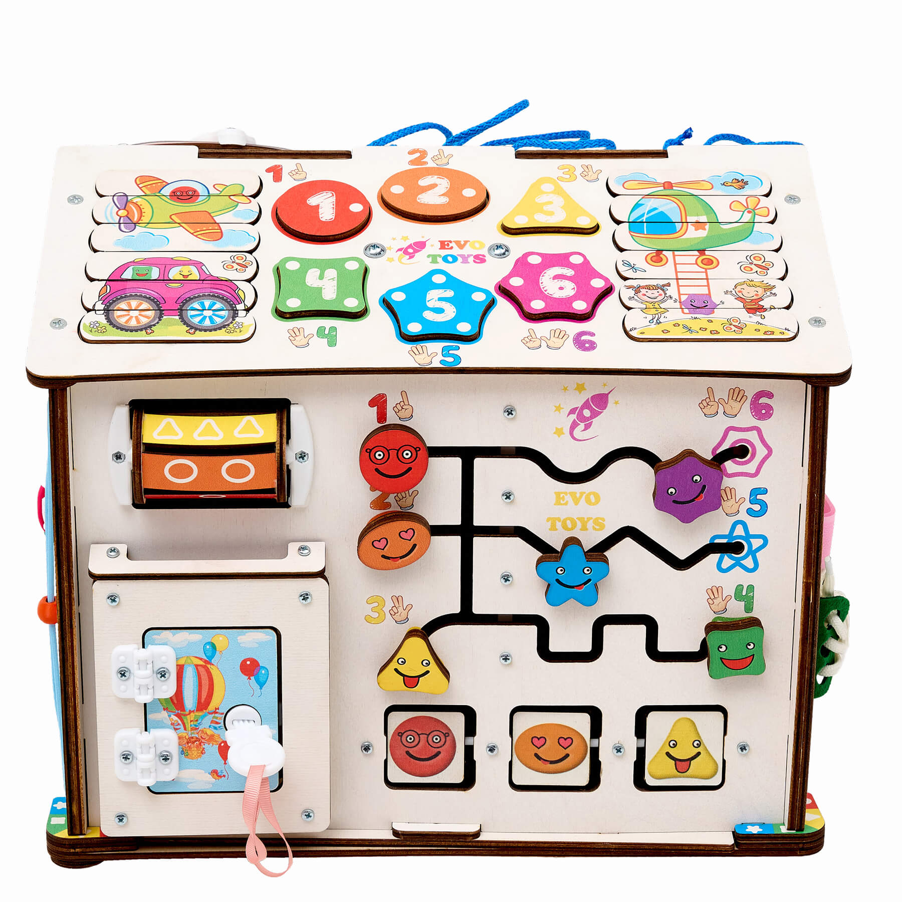 В верхней части игрового поля расположены три спиннера, большой и два маленьких. Слева и справа есть две разноцветные бусины, которые перемещаются по резинкам вверх и вниз. А в центральной части находятся две дверцы, окрашенные в четыре цвета и украшенные тематическими рисунками овощей, фруктов, смайлов и погодных явлений, которые соответствуют временам года. Дверцы закрываются на три замочка – форточный, щеколду и крючок. Открыв все, ребенок получает доступ ко внутреннему пространству домика, где может поселить кукол или припарковать машинки. Если включен блок подсветки, свет загорается и внутри домика.